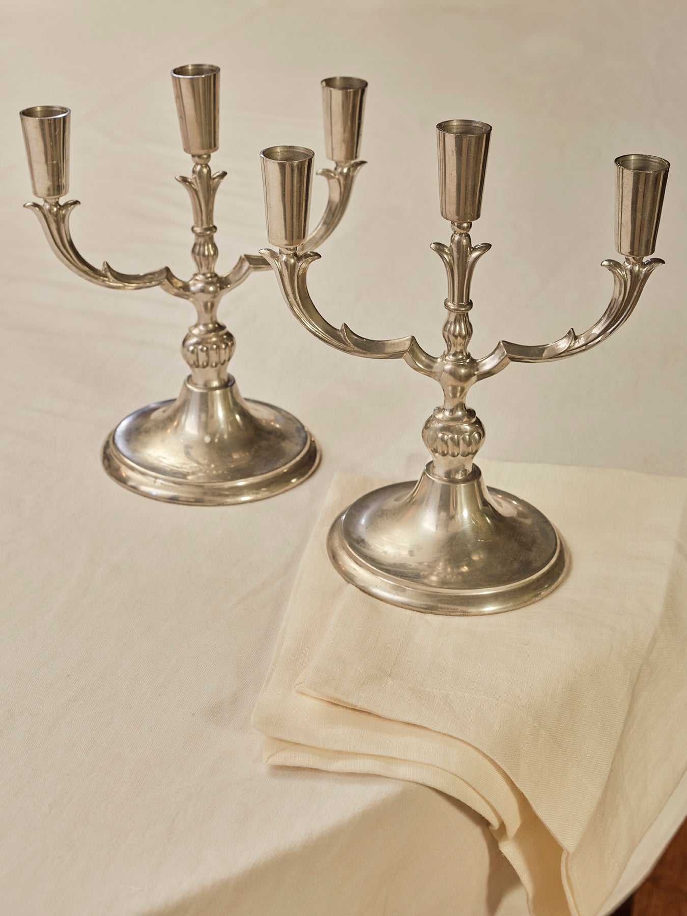 A pair of vintage, triple-armed pewter candlesticks made for Svenskt Tenn, Sweden.