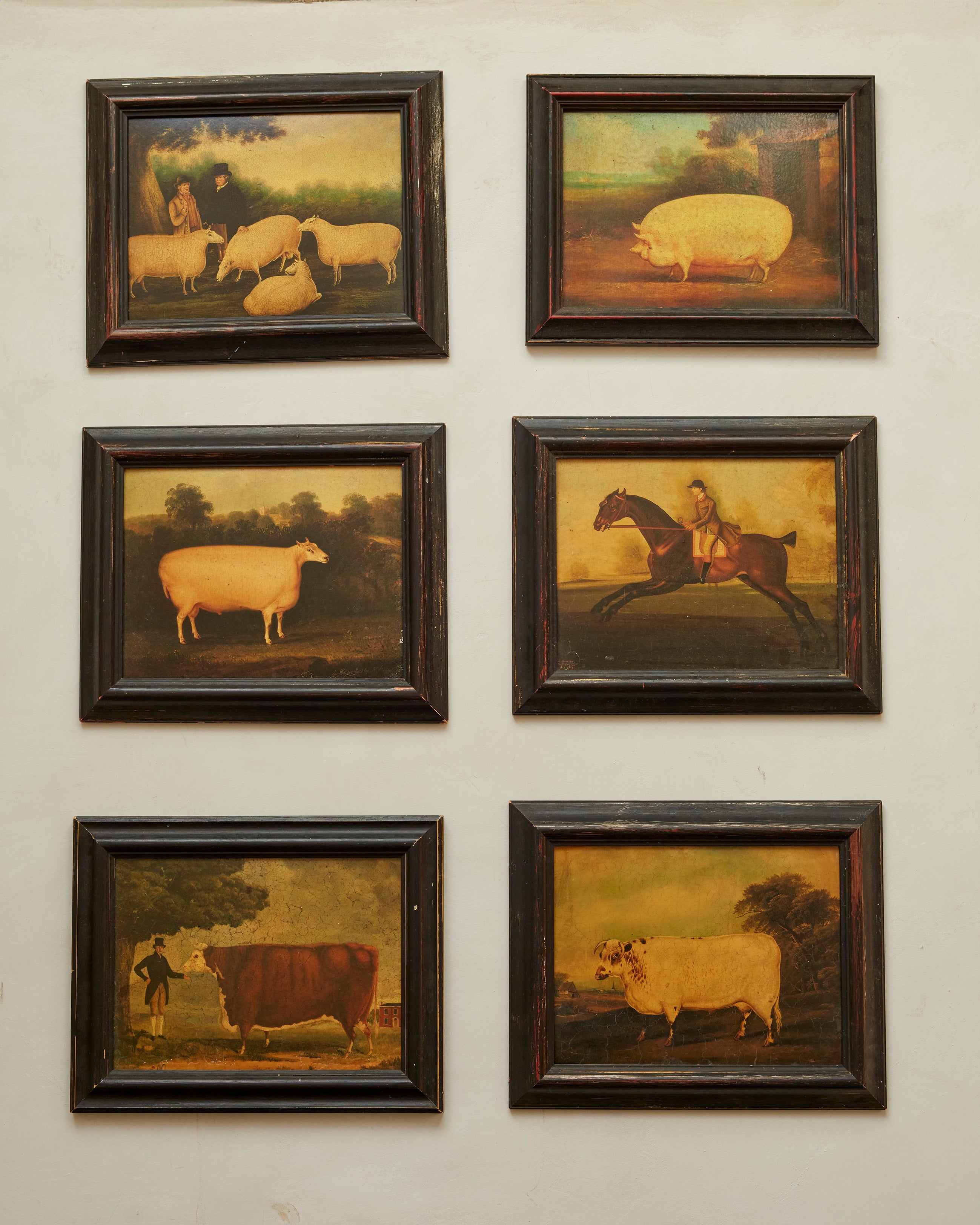 A striking set of six pastoral paintings depicting livestock and rural scenes, each beautifully framed in aged, painted timber.