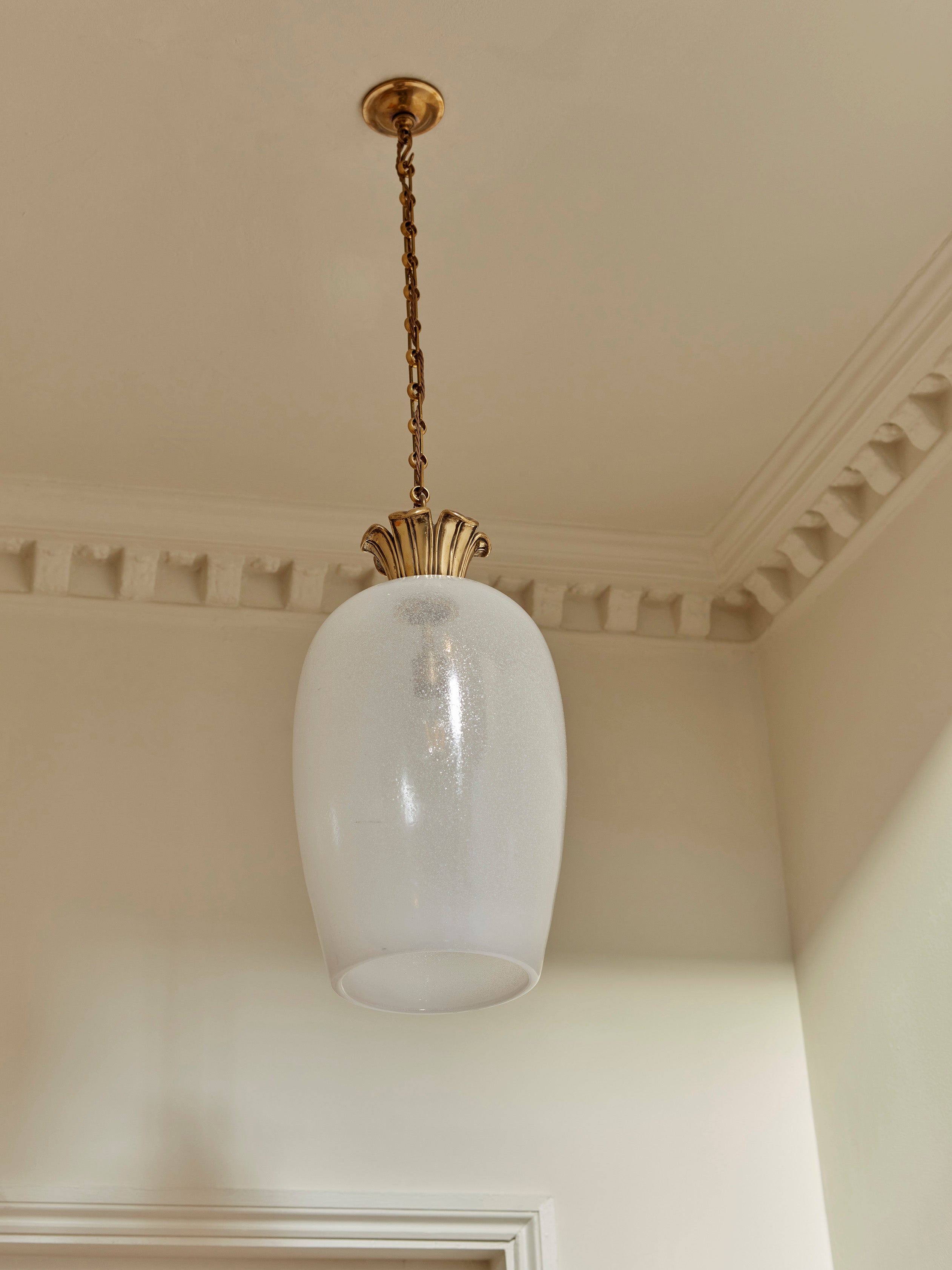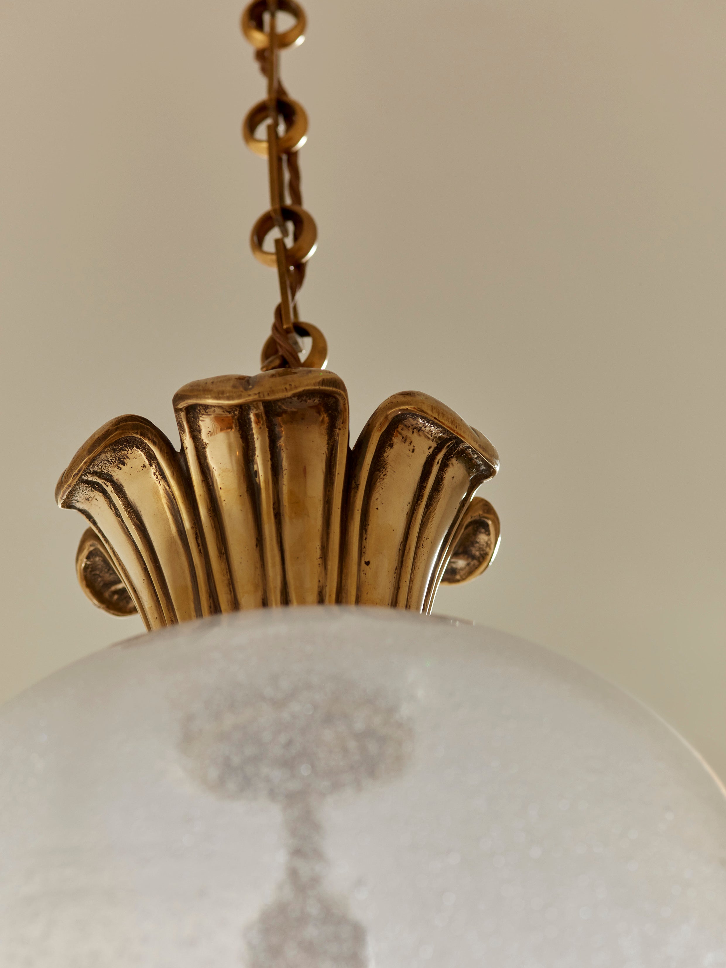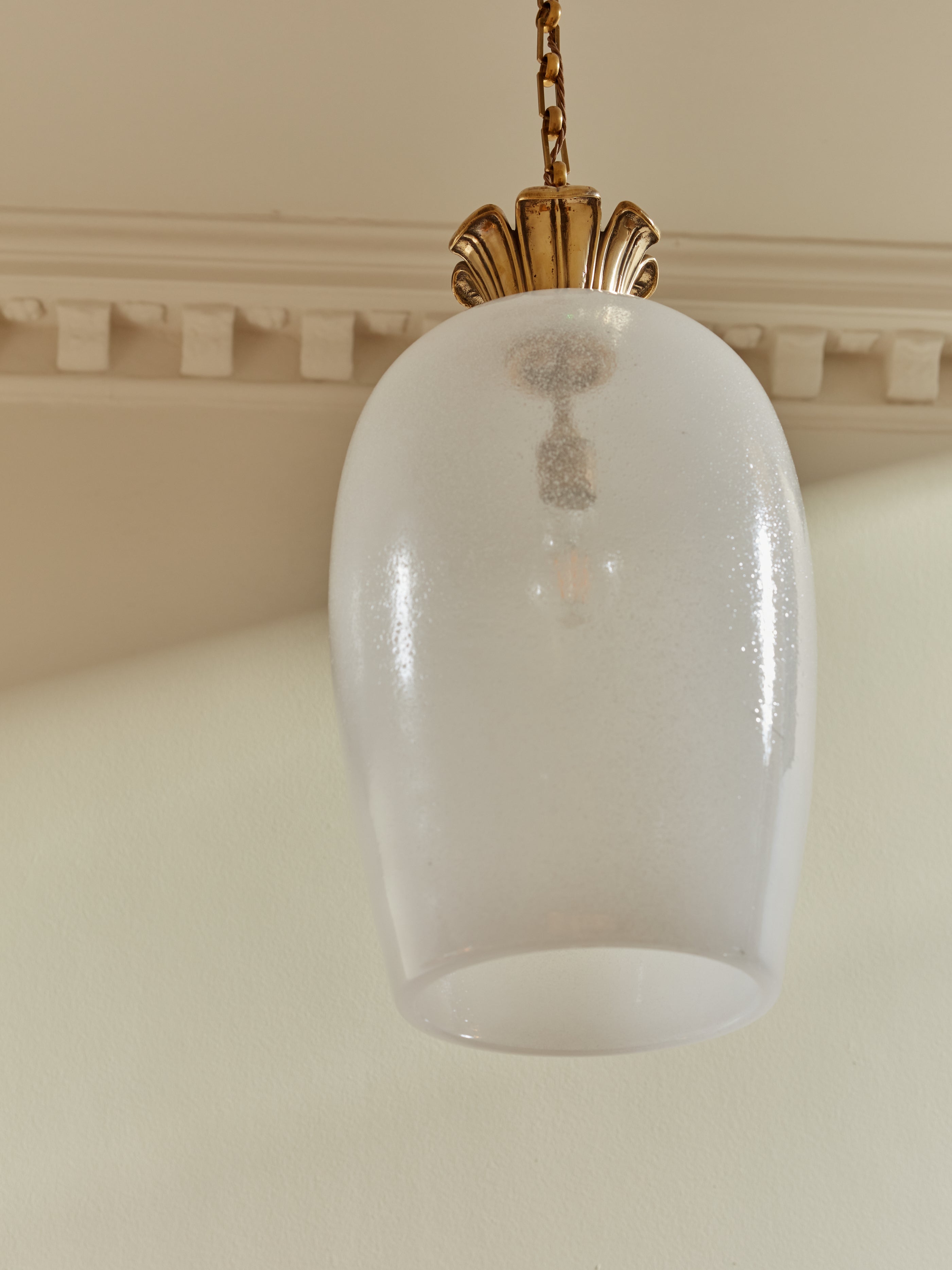 The hand-blown bubble glass shade; softly tapered and gently textured—offers a milky translucence that diffuses light with a quiet glow, evocative of candlelight through antique glass.