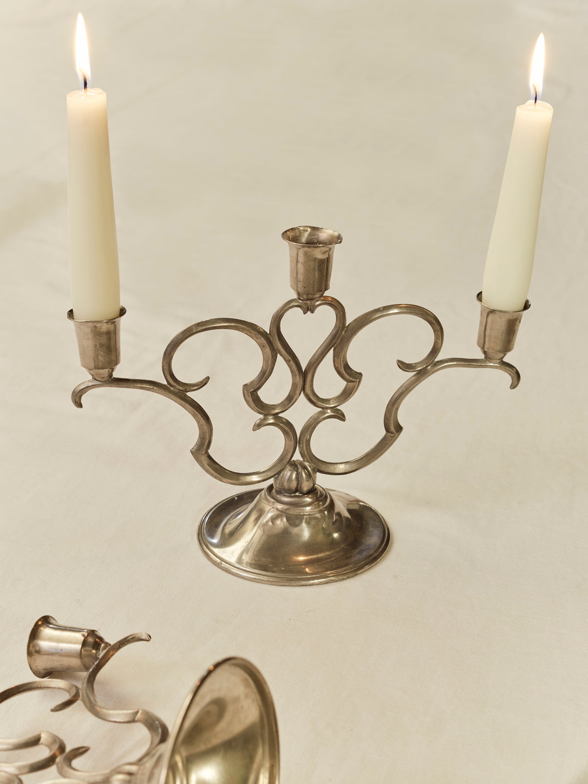 A pair of elegant, double-armed pewter candlesticks for Svenskt Tenn. Sweden, 1950's