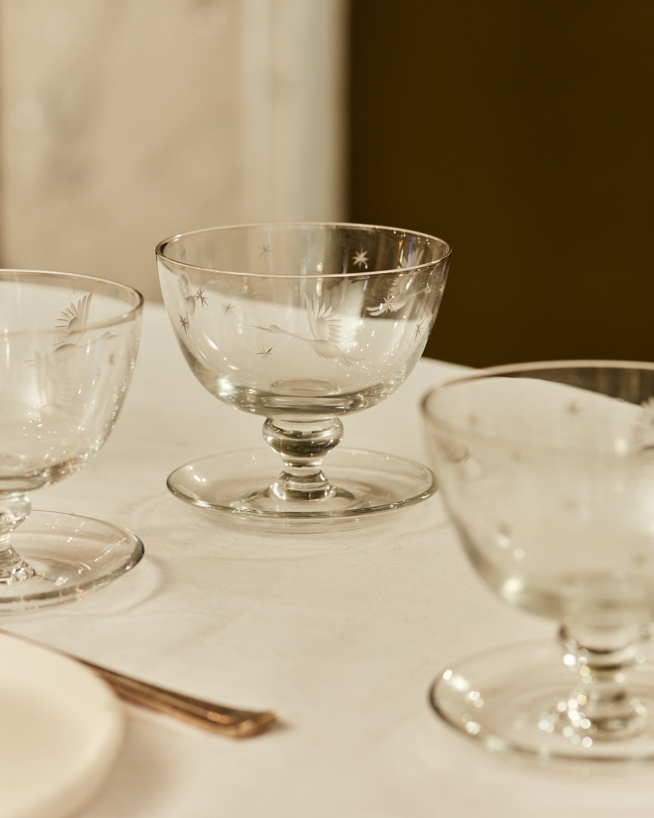 A beautiful set of ten coupe glasses from the 1920's. Delicately hand etched with stars and cranes.
