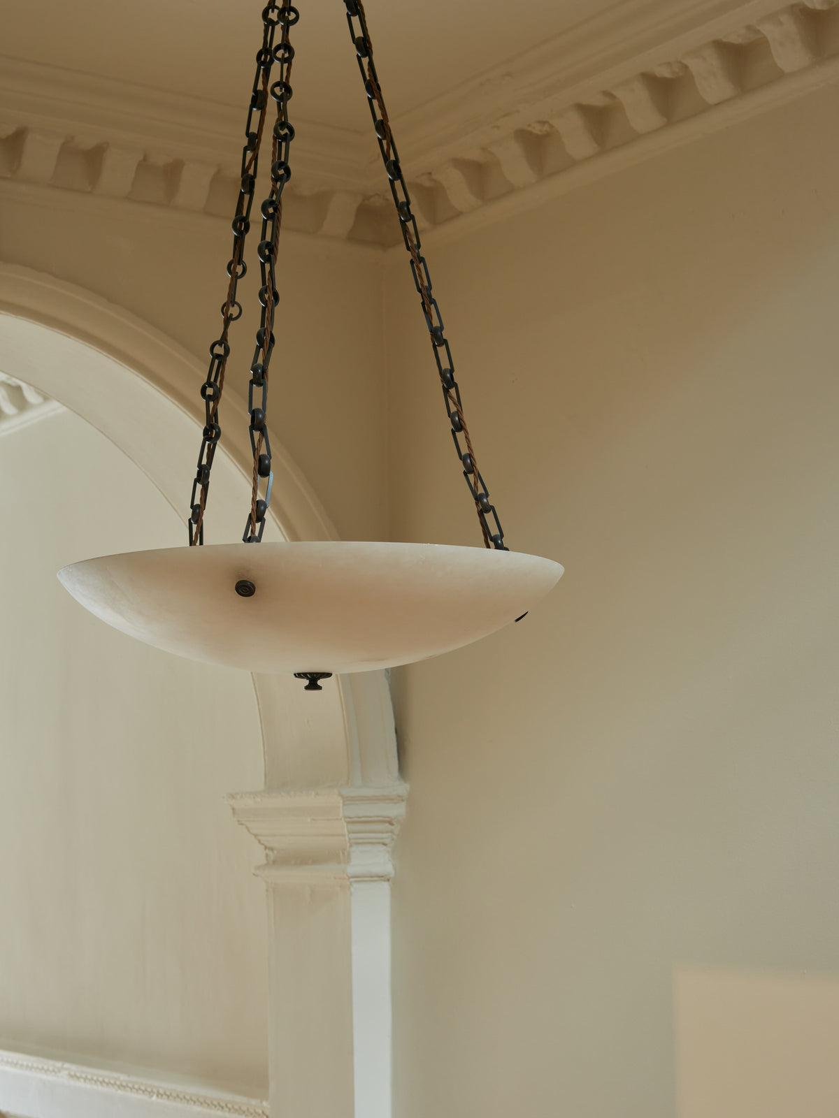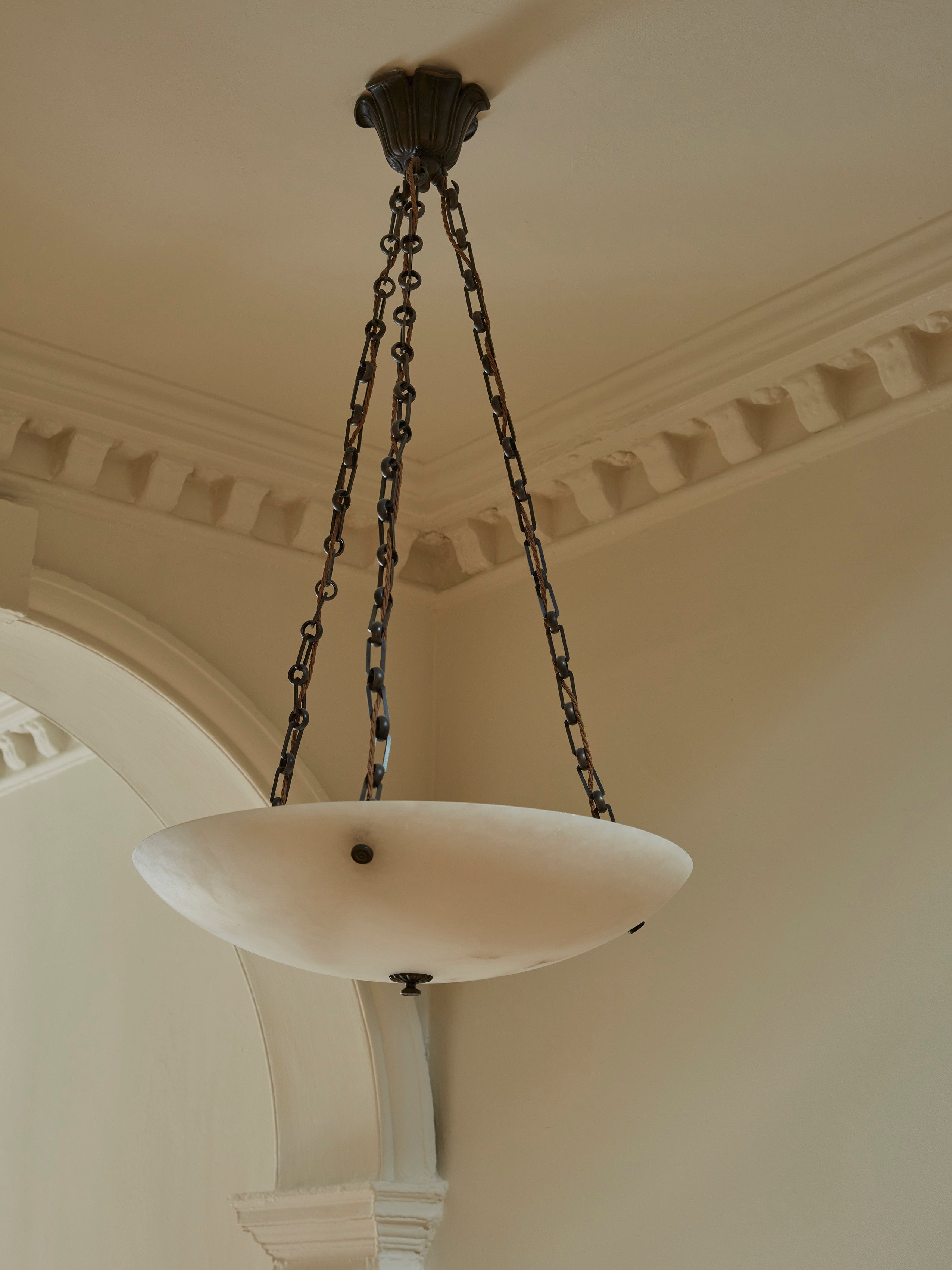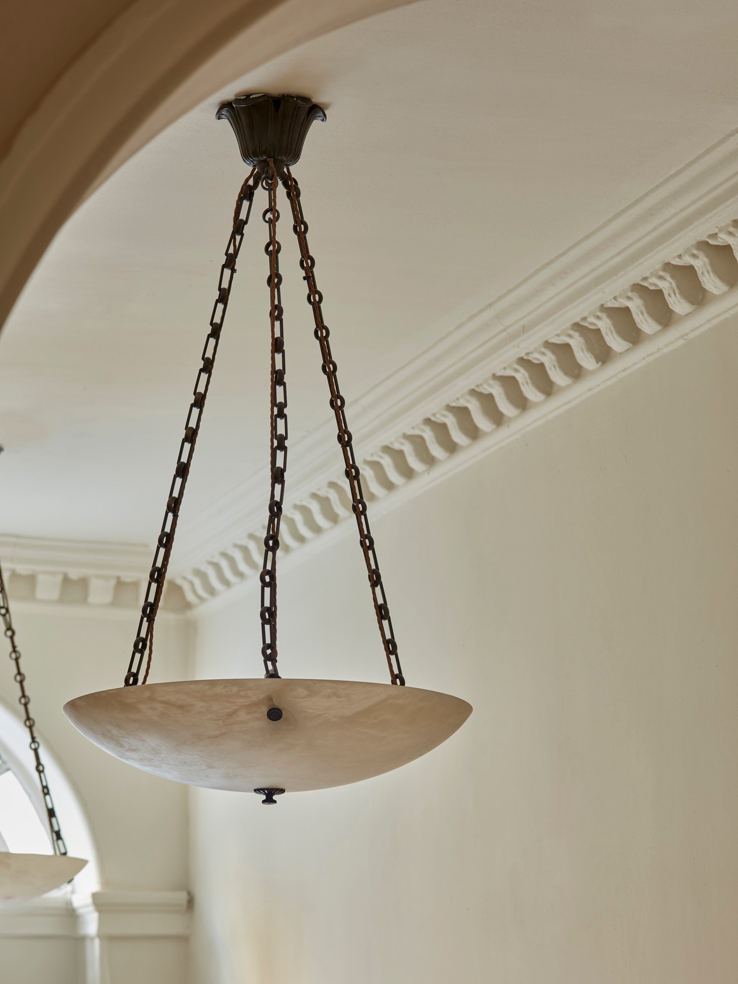 Drawing on classical motifs seen in the Stagshaw Wall Light, the Finch Pendant pairs solid brass metalwork with calm, softly glowing alabaster.
