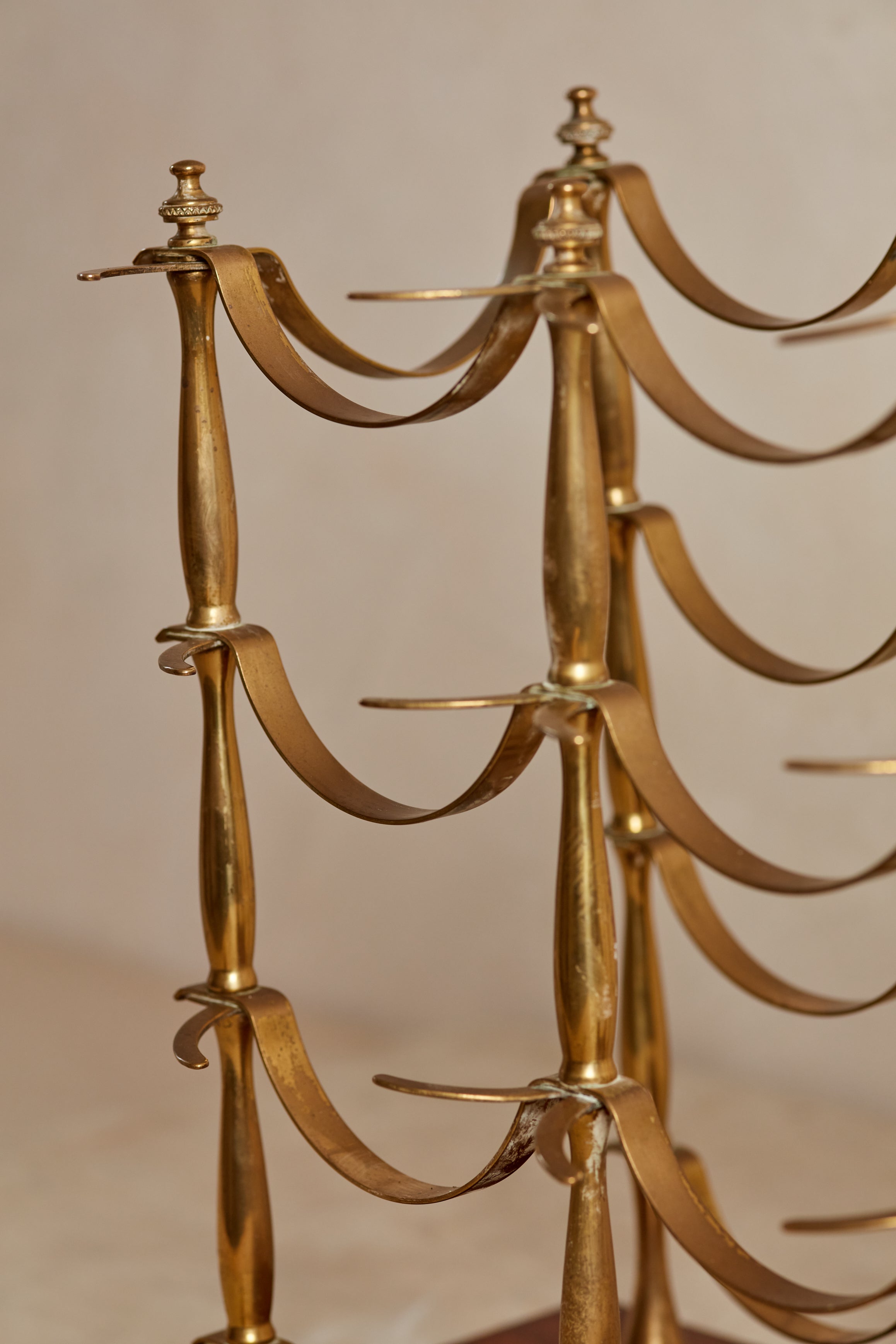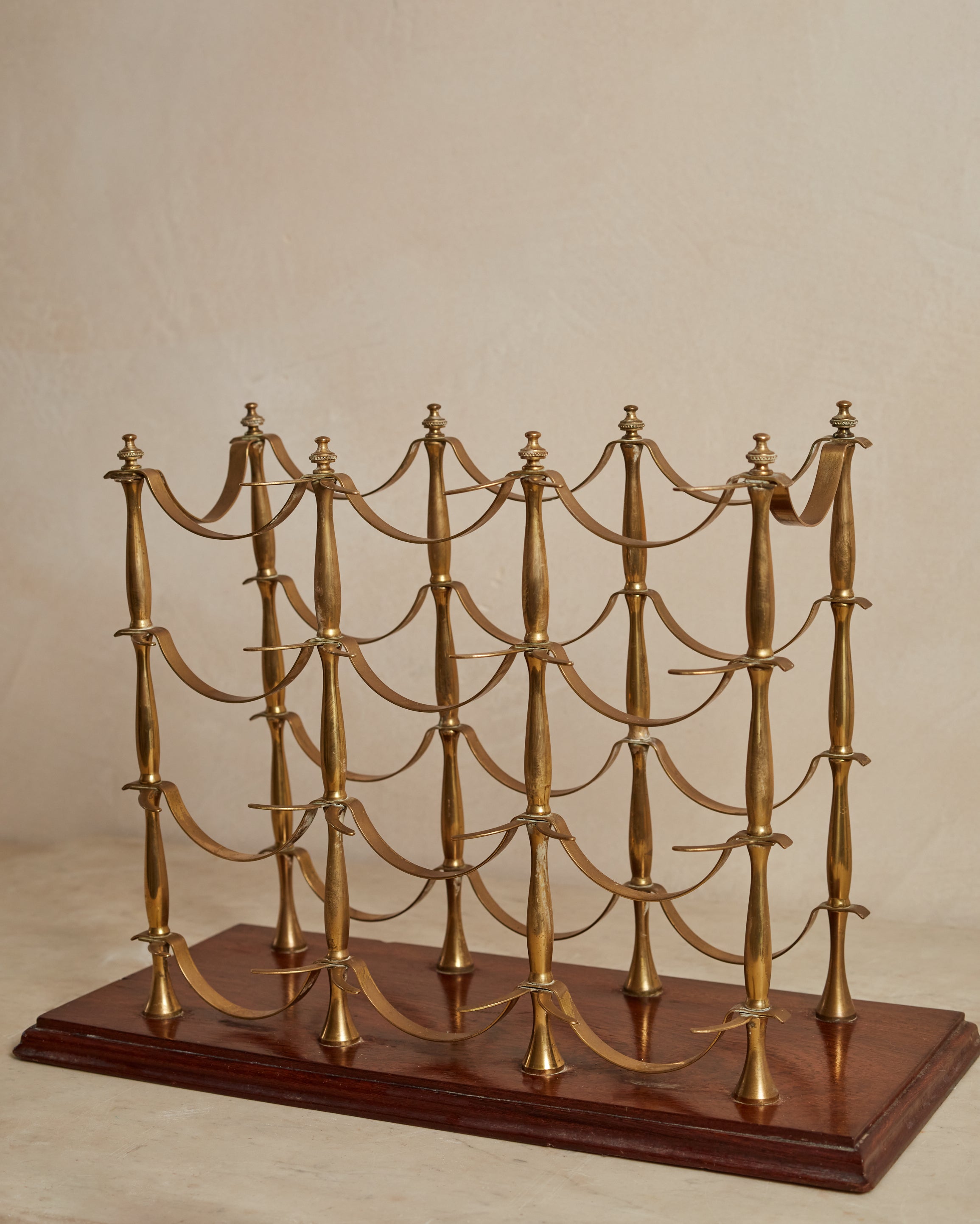 An early 20th century twelve bottle wine rack with brass detailing and a timber mahogany base. French, 1900's.
