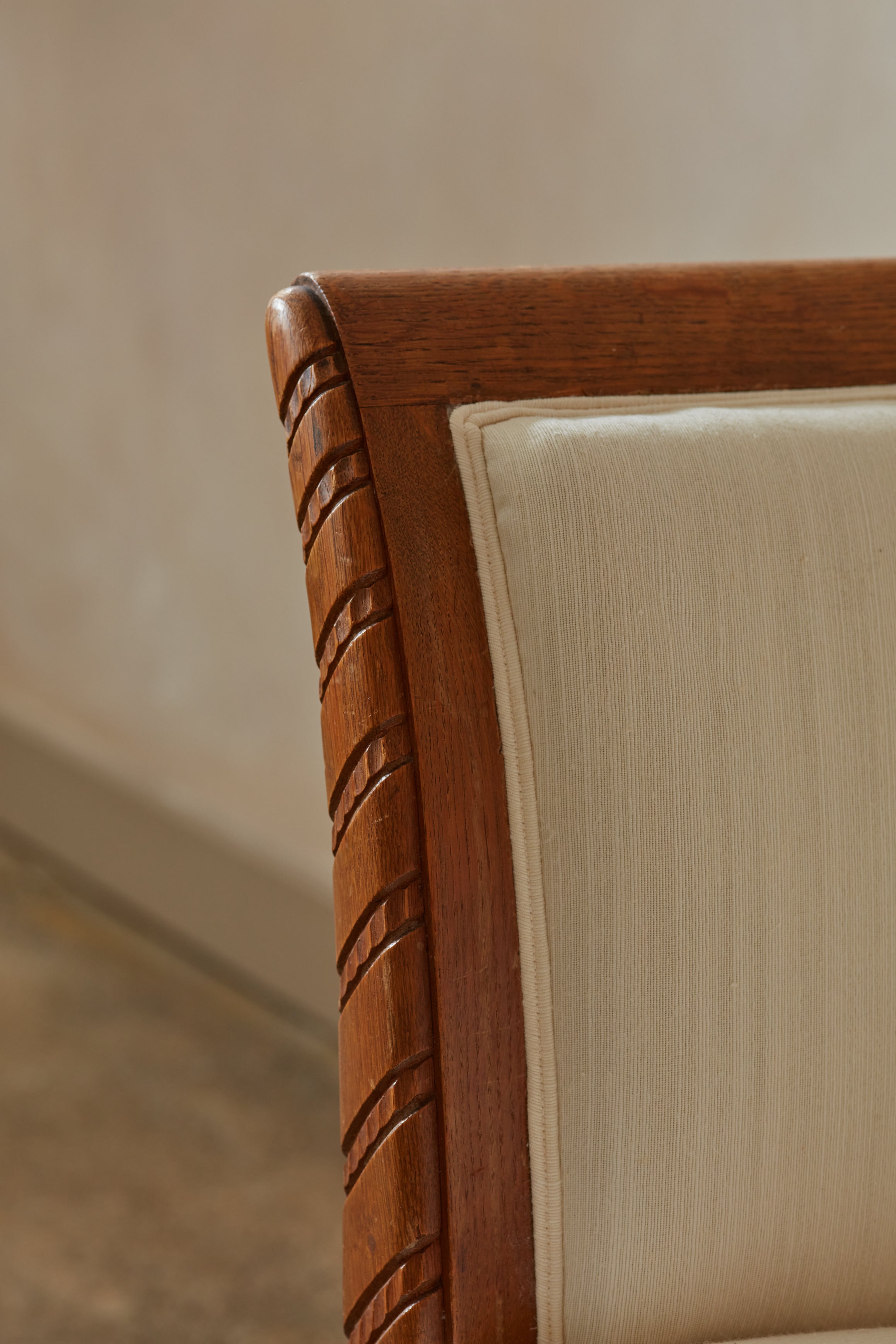 An elegant mid 20th century box sofa with splayed arms, bun feet and carved rail detailing