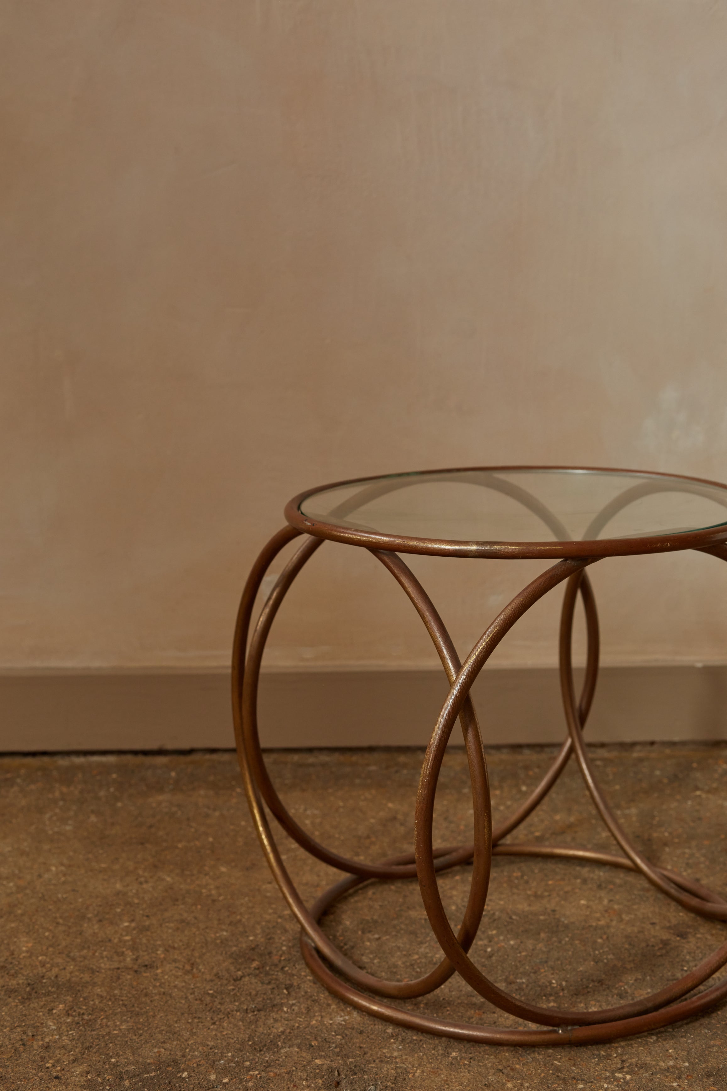A playful mid century brass and glass side table. Formed of circular brass hoops with one supporting a toughened glass top.