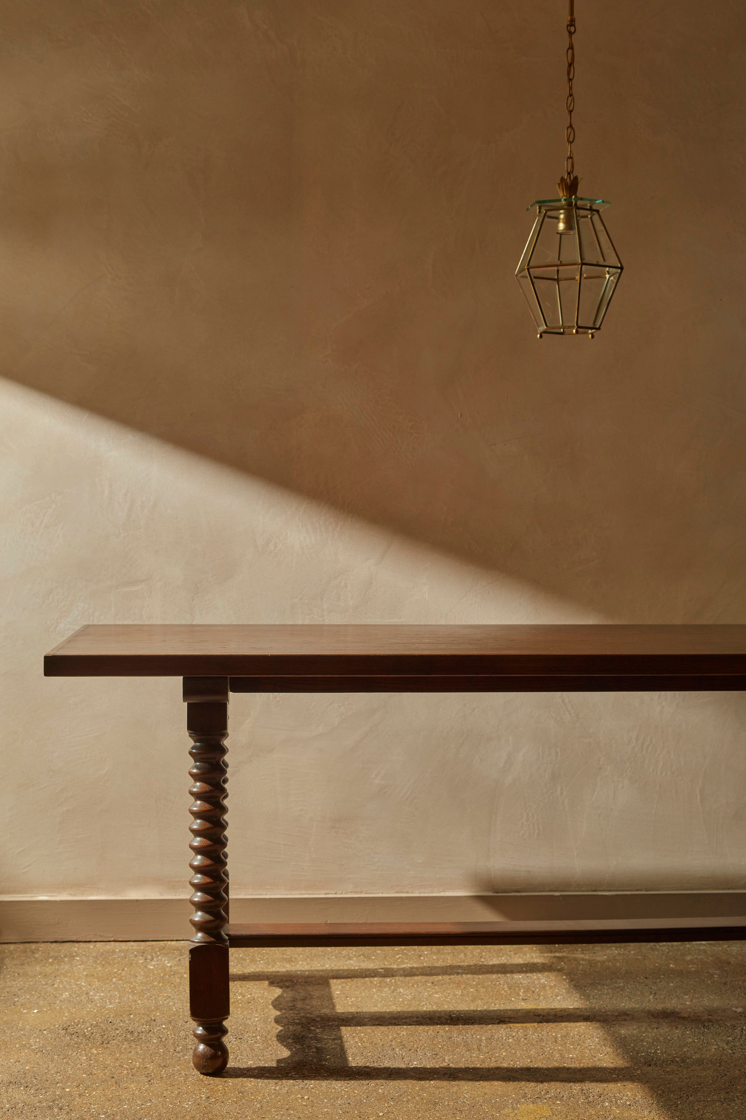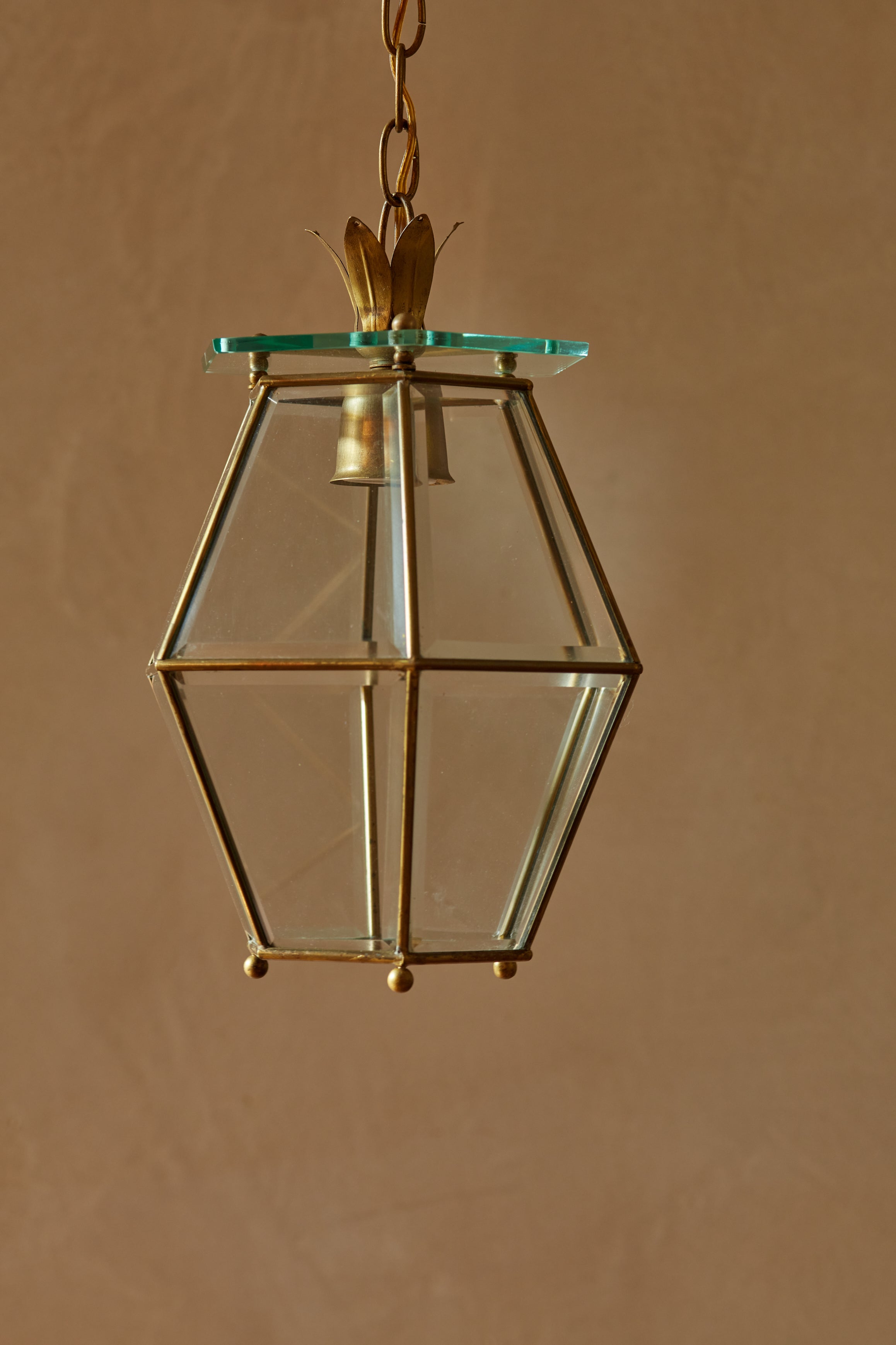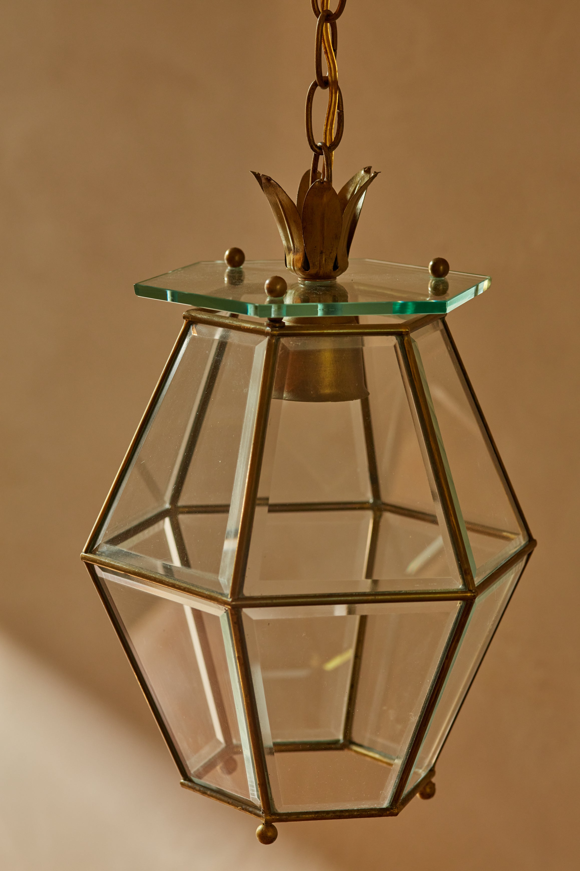A captivating, faceted hexagonal Italian pendant light in the manner of Adolf Loos. The glass panels have bevelled edges and the top of the fitting is crowned by a brass leaf crown. Italian 1950's.
