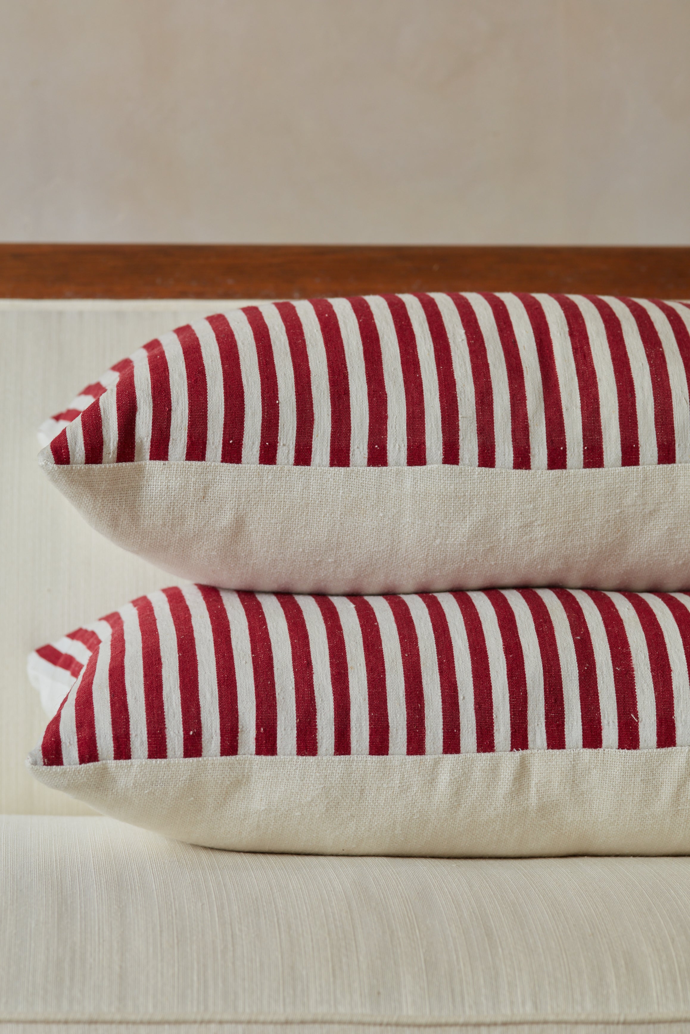 A limited edition of beautiful lumbar cushions each covered in an antique handwoven Dutch striped textile. The cushions work fabulously as a pair on a bed or dressed in front of a larger square cushion on a sofa,