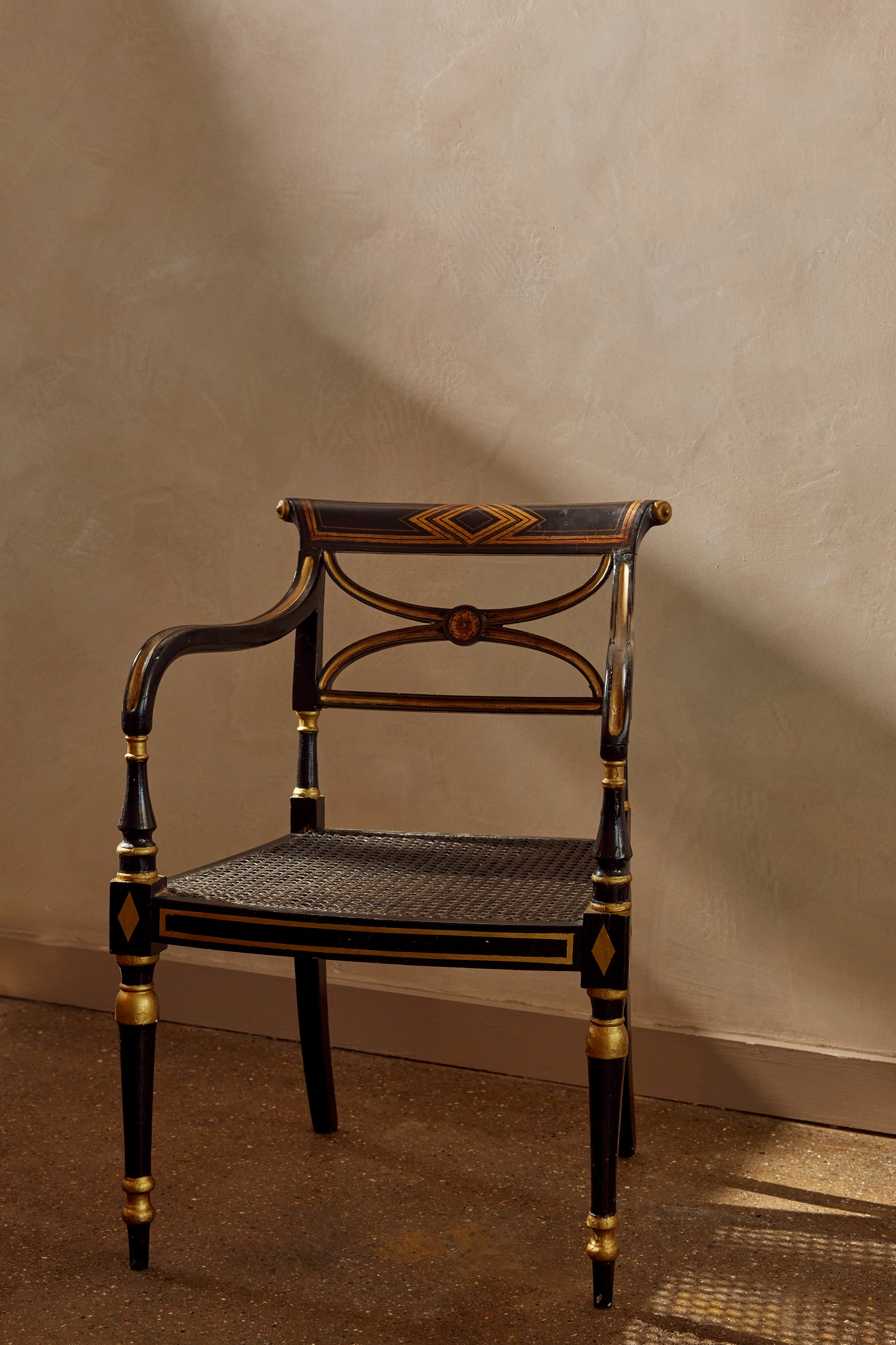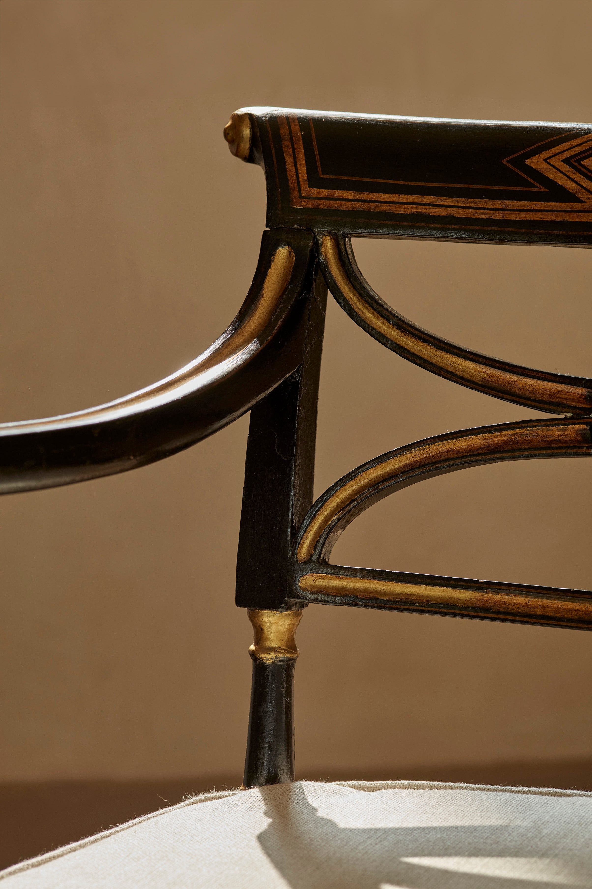 A black lacquered Regency armchair with gilt detailing and an upholstered, linen squab seat pad. Wonderful in a hallway or as a desk chair.