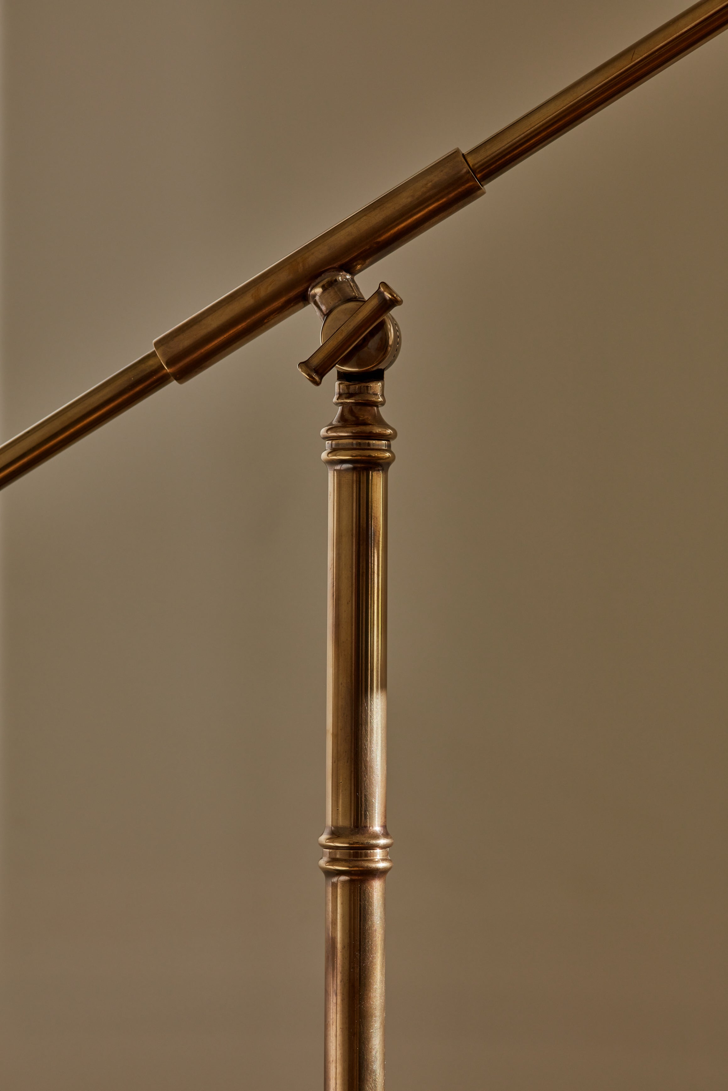 The stem, shaped to echo the rhythm and texture of bamboo, is crafted in antiqued brass and set into a simple, weighty base.