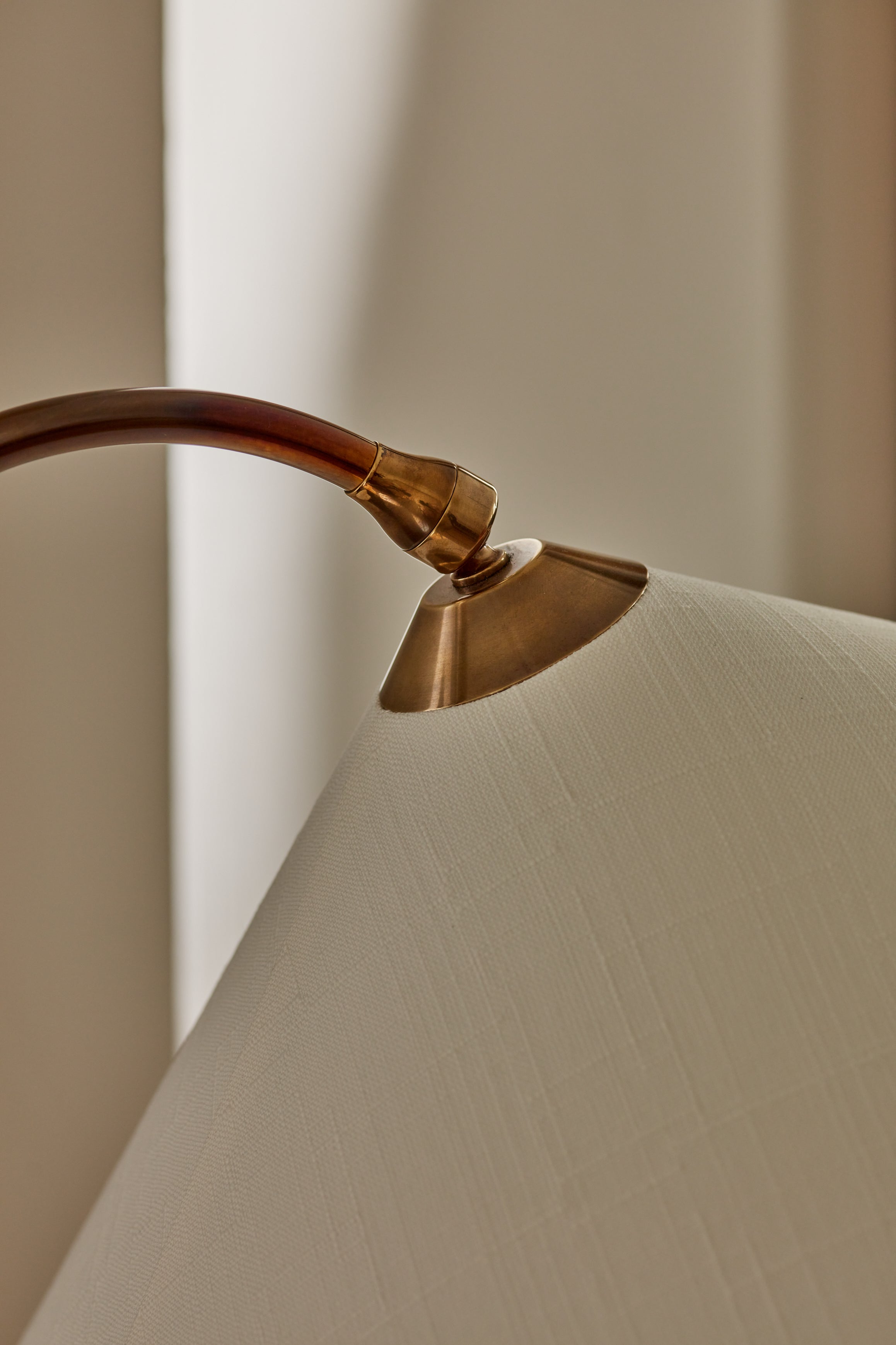 A considered composition of natural materials and understated form; our Wimpole floor lamp balances lightness with a grounding presence.